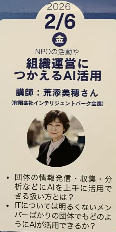 | テーマ | 仲間と育つ、これからの“県民活動リーダー”へ チームづくり・コミュニケーション・AAIIでひろがる活動の力 | 講座名 | NPOの活動や組織運営につかえるAI活用 |
